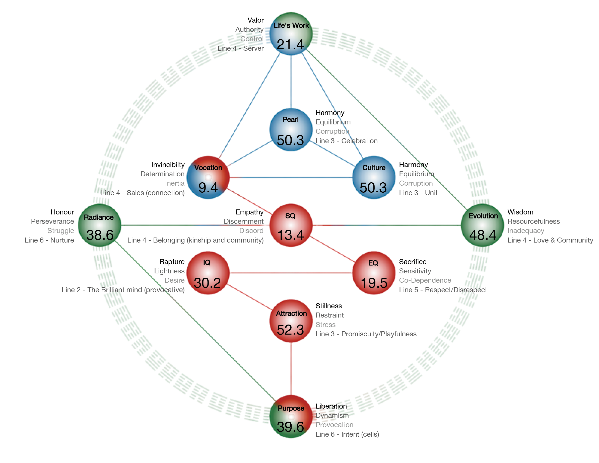 Paraugs kā izskatās Gēnu atslēgu ceļš. Zaļie aplīši norāda ceļa pirmo posmu - iekšējā Ģēnija atklāšanas ceļu.